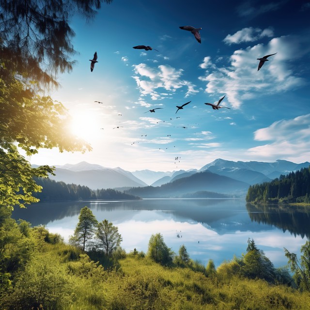 宁静的自然画布宁静的山湖和翱翔的飞鸟