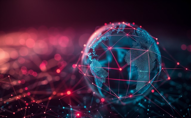 全球无线网络。数字未来中的区块链技术。对等数据库。多边形网格上地球
