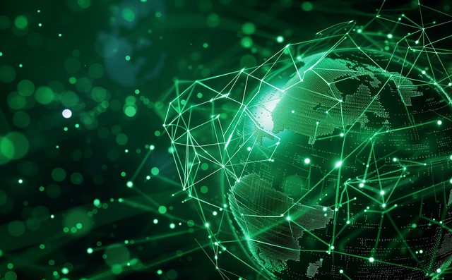 全球无线网络。数字未来中的区块链技术。对等数据库。多边形网格上地球
