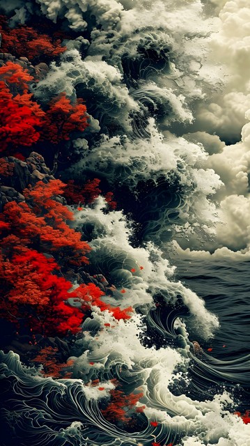 这是一张艺术插画,它融合了自然元素和抽象风格。画面中可以看到汹涌的海浪、红色的树木以及云雾缭绕的天空