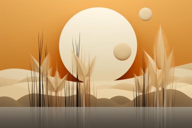几何与自然元素的墙艺,月亮下的树形装饰