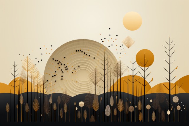几何与自然元素的墙艺,月亮下的树形装饰