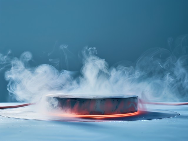 一个简约的背景,展示了超导体被液氮冷却,周围升腾着蒸汽。