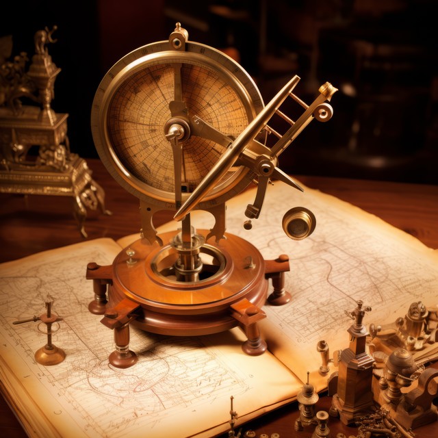 一张描绘了放在世界地图上的黄铜星盘的插图星盘旁边散落着其他古董物品