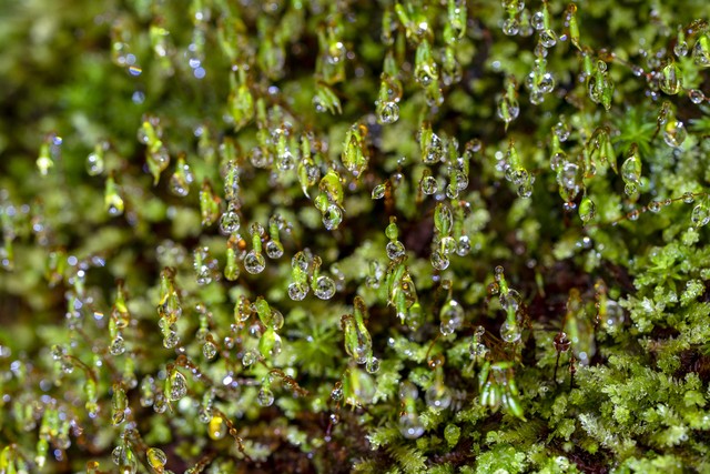 墙藓苔藓带着闪闪发光的水滴