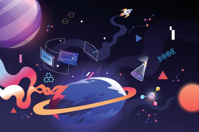 卡通VR虚拟现实体验技术互联网宇宙x,q太空女孩娱乐休闲物联网商务电商促销科技概念背景渐变矢量插画