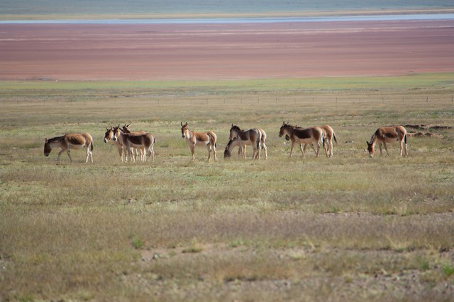 西藏那曲羌塘国家级自然保护区秋天,在吃草的藏野驴