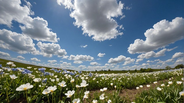 春天田野上盛开的白色和蓝色花朵、蓝天白云和广阔视野的美丽自然风景