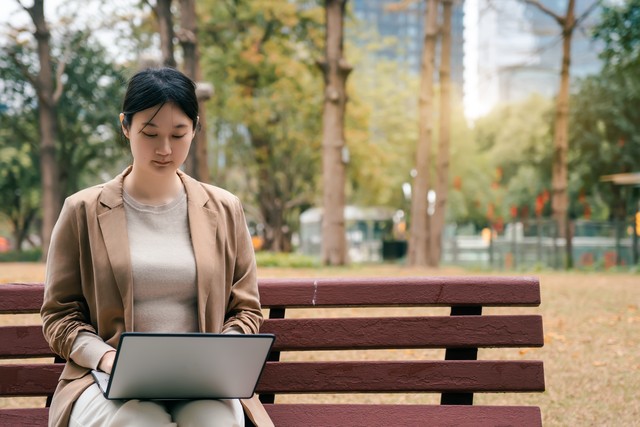 职业女性在城市公园的笔记本电脑上工作