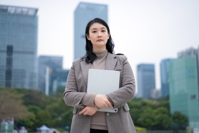 年轻的职业女性在城市中拿着平板电脑
