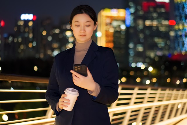 年轻的专业人士在旅途中使用智能手机和咖啡