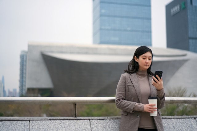年轻的专业人士在旅途中使用智能手机和咖啡