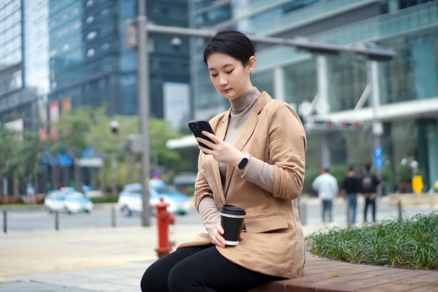 年轻的专业人士在旅途中使用智能手机和咖啡