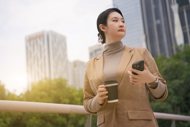 年轻的专业人士在旅途中使用智能手机和咖啡