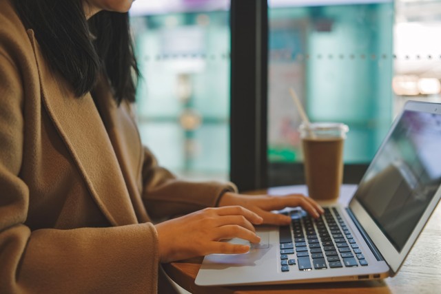 年轻女子在舒适的咖啡店用笔记本电脑工作