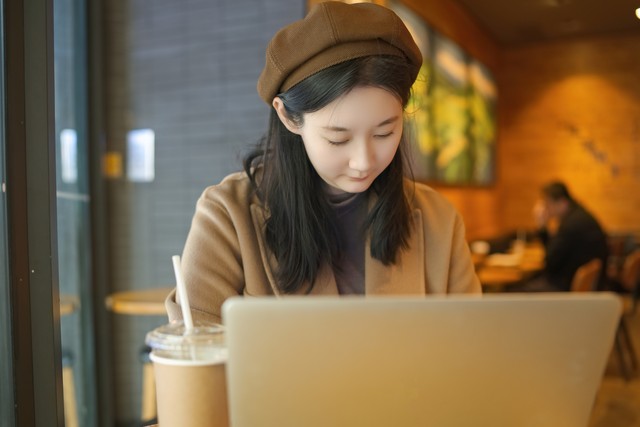 年轻女子在舒适的咖啡店用笔记本电脑工作