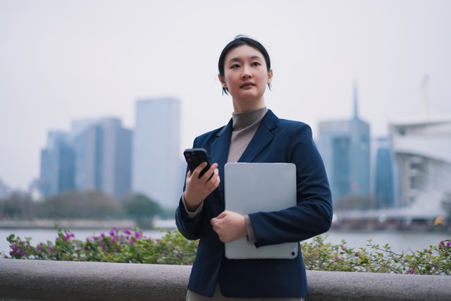在城市景观中多任务处理的职业女性