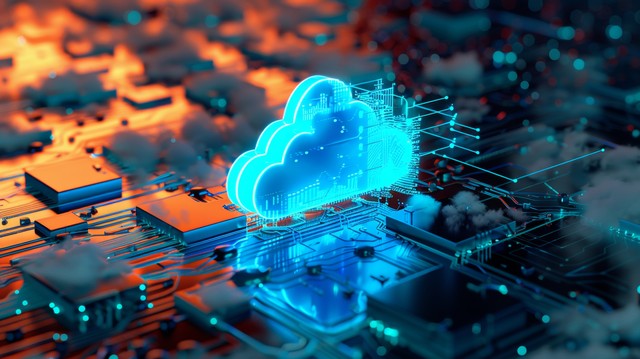 数字背景上发光的蓝色云图标的 3D 渲染,带有数据和技术元素,采用数据中心或在线存储概念的风格