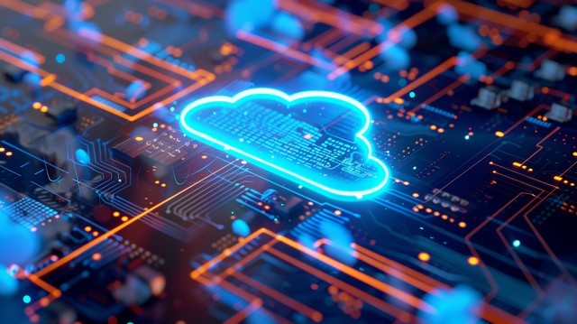 数字背景上发光的蓝色云图标的 3D 渲染,带有数据和技术元素,采用数据中心或在线存储概念的风格