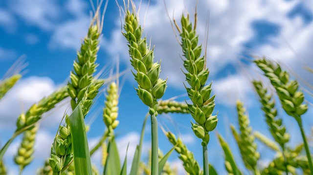 前景是绿色麦穗的特写,背景是蓝天和白云。 该场景在明亮的日光背景下捕捉到了大自然馈赠的自然之美。