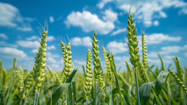 前景是绿色麦穗的特写,背景是蓝天和白云。 该场景在明亮的日光背景下捕捉到了大自然馈赠的自然之美。
