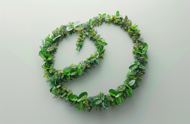由植物制成的绿色和白色无限符号,象征着自然元素之间的无限循环,以孤立的灰色背景为背景。