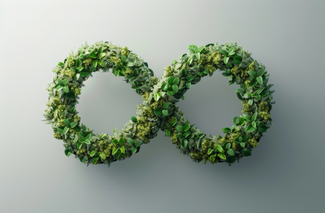 由植物制成的绿色和白色无限符号,象征着自然元素之间的无限循环,以孤立的灰色背景为背景。