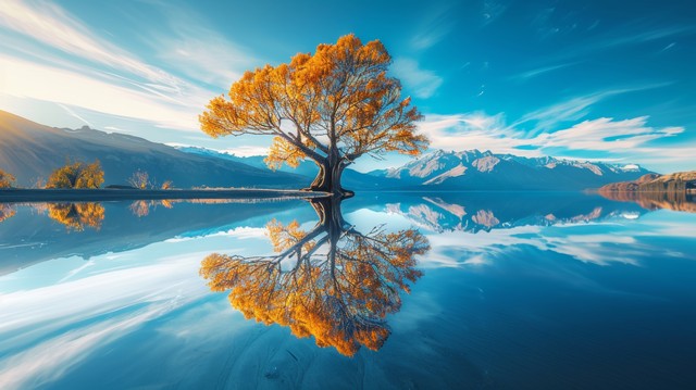 新西兰西克尔斯湖上这棵标志性树的令人惊叹的照片,完美地映衬着平静的水面,背景是山脉和蓝天。