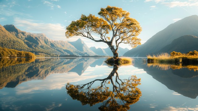 新西兰西克尔斯湖上这棵标志性树的令人惊叹的照片,完美地映衬着平静的水面,背景是山脉和蓝天。