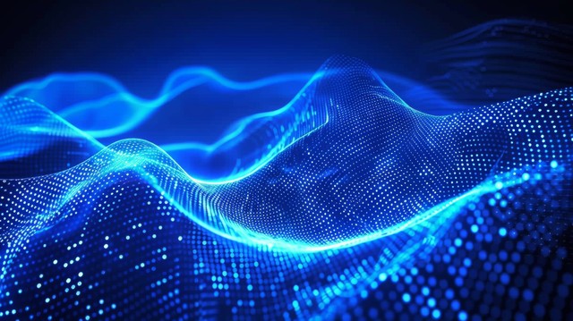抽象的蓝色数字背景,具有发光的网络连接和黑暗背景下的数据流波,未来技术概念。