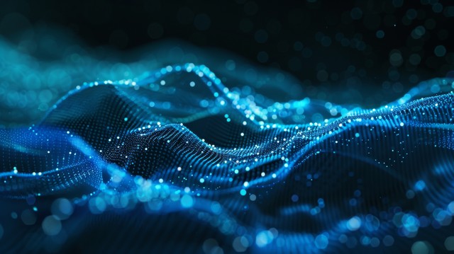 抽象的蓝色数字背景,具有发光的网络连接和黑暗背景下的数据流波,未来技术概念。
