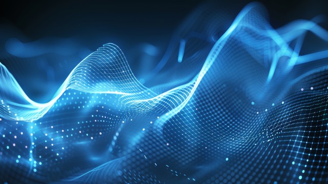 抽象的蓝色数字背景,具有发光的网络连接和黑暗背景下的数据流波,未来技术概念。
