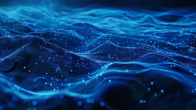 抽象的蓝色数字背景,具有发光的网络连接和黑暗背景下的数据流波,未来技术概念。