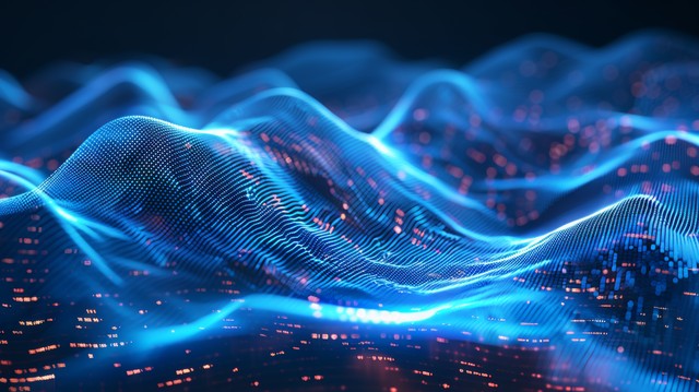 抽象的蓝色数字背景,具有发光的网络连接和黑暗背景下的数据流波,未来技术概念。