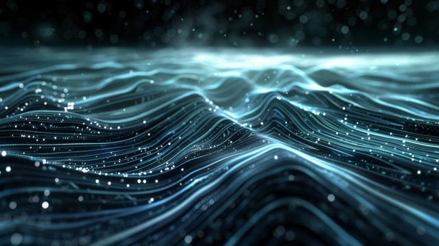 抽象的蓝色数字背景,具有发光的网络连接和黑暗背景下的数据流波,未来技术概念。