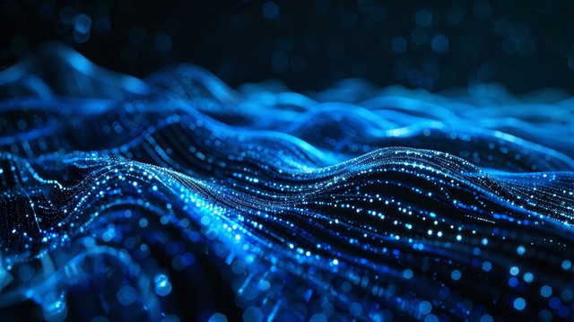 带有蓝色线条和波浪的抽象数字背景,在黑色背景上创造出运动和深度的错觉。 该设计以技术风格象征着与技术