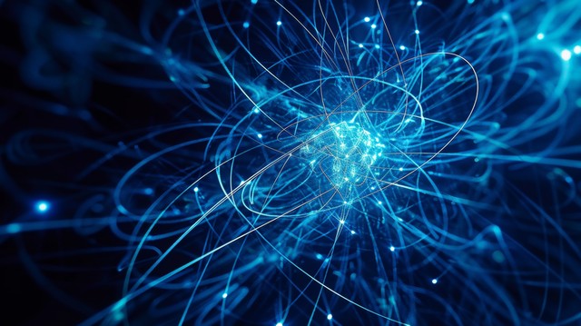 带有蓝色线条和波浪的抽象数字背景,在黑色背景上创造出运动和深度的错觉。 该设计以技术风格象征着与技术