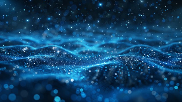 带有蓝色线条和波浪的抽象数字背景,在黑色背景上创造出运动和深度的错觉。 该设计以技术风格象征着与技术