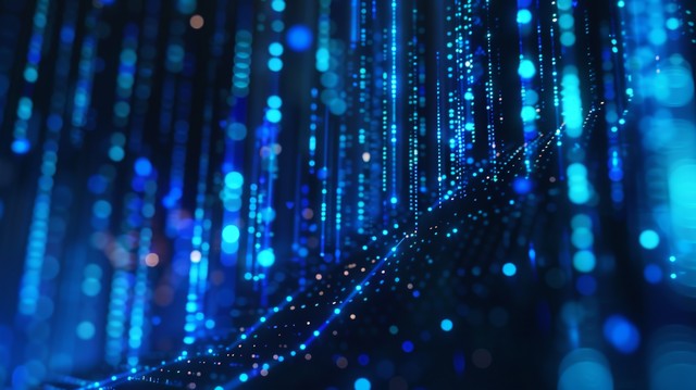 带有蓝色线条和波浪的抽象数字背景,在黑色背景上创造出运动和深度的错觉。 该设计以技术风格象征着与技术
