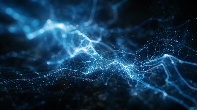 带有蓝色线条和波浪的抽象数字背景,在黑色背景上创造出运动和深度的错觉。 该设计以技术风格象征着与技术
