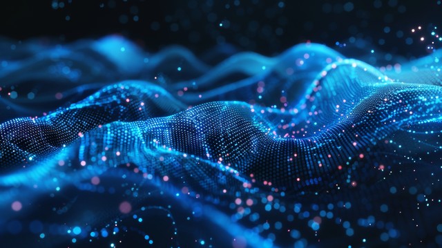 带有蓝色线条和波浪的抽象数字背景,在黑色背景上创造出运动和深度的错觉。 该设计以技术风格象征着与技术
