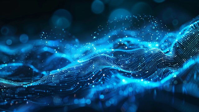 带有蓝色线条和波浪的抽象数字背景,在黑色背景上创造出运动和深度的错觉。 该设计以技术风格象征着与技术