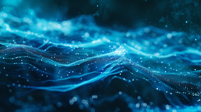 带有蓝色线条和波浪的抽象数字背景,在黑色背景上创造出运动和深度的错觉。 该设计以技术风格象征着与技术