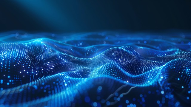 带有蓝色线条和波浪的抽象数字背景,在黑色背景上创造出运动和深度的错觉。 该设计以技术风格象征着与技术
