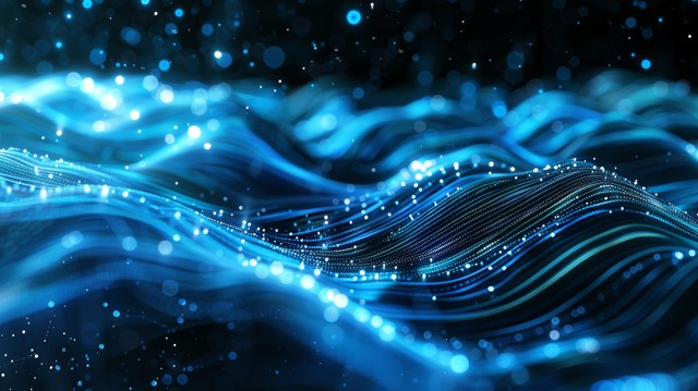 抽象的未来派蓝色发光粒子背景与散景灯和波浪元素,采用 AI 数字技术概念的风格。