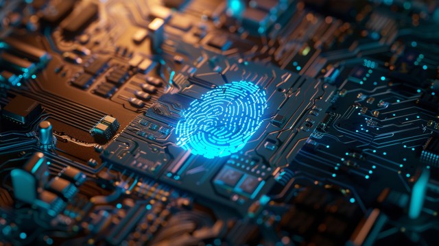 电路板上永久数字发光的蓝色指纹,象征着生物识别安全技术和数据保护的未来。
