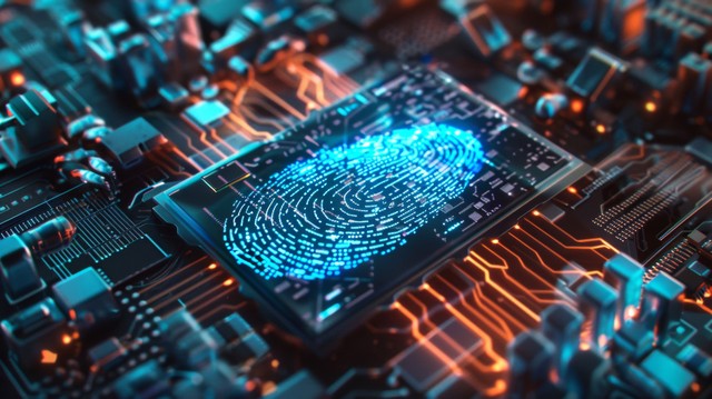 电路板上永久数字发光的蓝色指纹,象征着生物识别安全技术和数据保护的未来。
