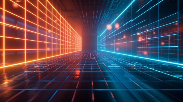 带有蓝色和橙色灯光的数字网格背景,代表虚拟现实或未来技术的概念。