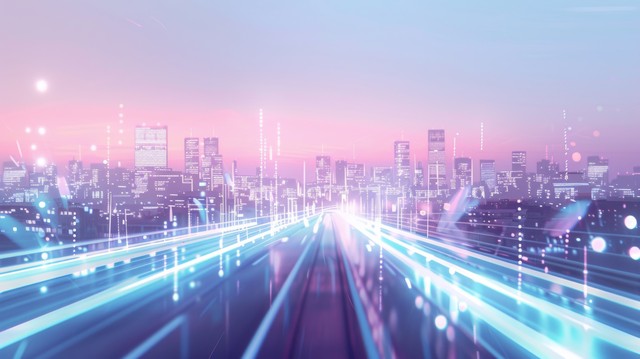 带有蓝色和橙色灯光的数字网格背景,代表虚拟现实或未来技术的概念。