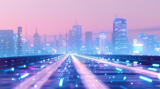 带有蓝色和橙色灯光的数字网格背景,代表虚拟现实或未来技术的概念。